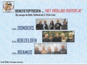 Op 19 mei was het zover. De familie Dekkers vond het weer eens tijd geworden voor een feestje en organiseerde een ouderwets muziekfeest in de manege, die voor deze gelegenheid werd omgetoverd tot een feesthal. Hoewel Jos Dekkers zelf niet meer op het podium was te vinden, zijn hij en Wies de drijvende kracht achter dit terugkerend festijn. Er werd wederom in verschillende samenstellingen en verschillende stijlen gemusiceerd door muzikanten uit de familie en kennissenkring van de familie Dekkers. De bonnenverkoop voor de verschillende drankjes etc., liep ook weer als een trein en dat allemaal voor het goede doel. Dat goede doel was natuurlijk de Stichting Paardrijden voor Gehandicapten Het Vrolijke Ruitertje. Onze stichting heeft in de manege “de Belle” bij Jos en Wies Dekkers een solide thuisbasis gevonden, waar elke week op de maandagavond en donderdagavond wordt gereden door de gehandicapte ruitertjes, bijgestaan door een groep enthousiaste vrijwilligers, die inmiddels ook “kind aan huis” zijn in de manege.